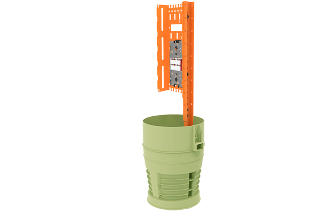 The Plugin Optics 8-inch Universal Distribution Pedestal provides a protective enclosure for, outside plant (OSP), above ground splices and terminations of buried feeder fiber and customer drop fiber cables. Used for both Greenfield and Brownfield applications at mid-span or stub-in points. Made with non-metallic, non-conductive, injection molded plastic, Plugin Optics 8-inch Universal Distribution Pedestals provide a rugged and durable enclosure to protect against weather, dirt, flooding, fire and impact for OSP above-grade applications.